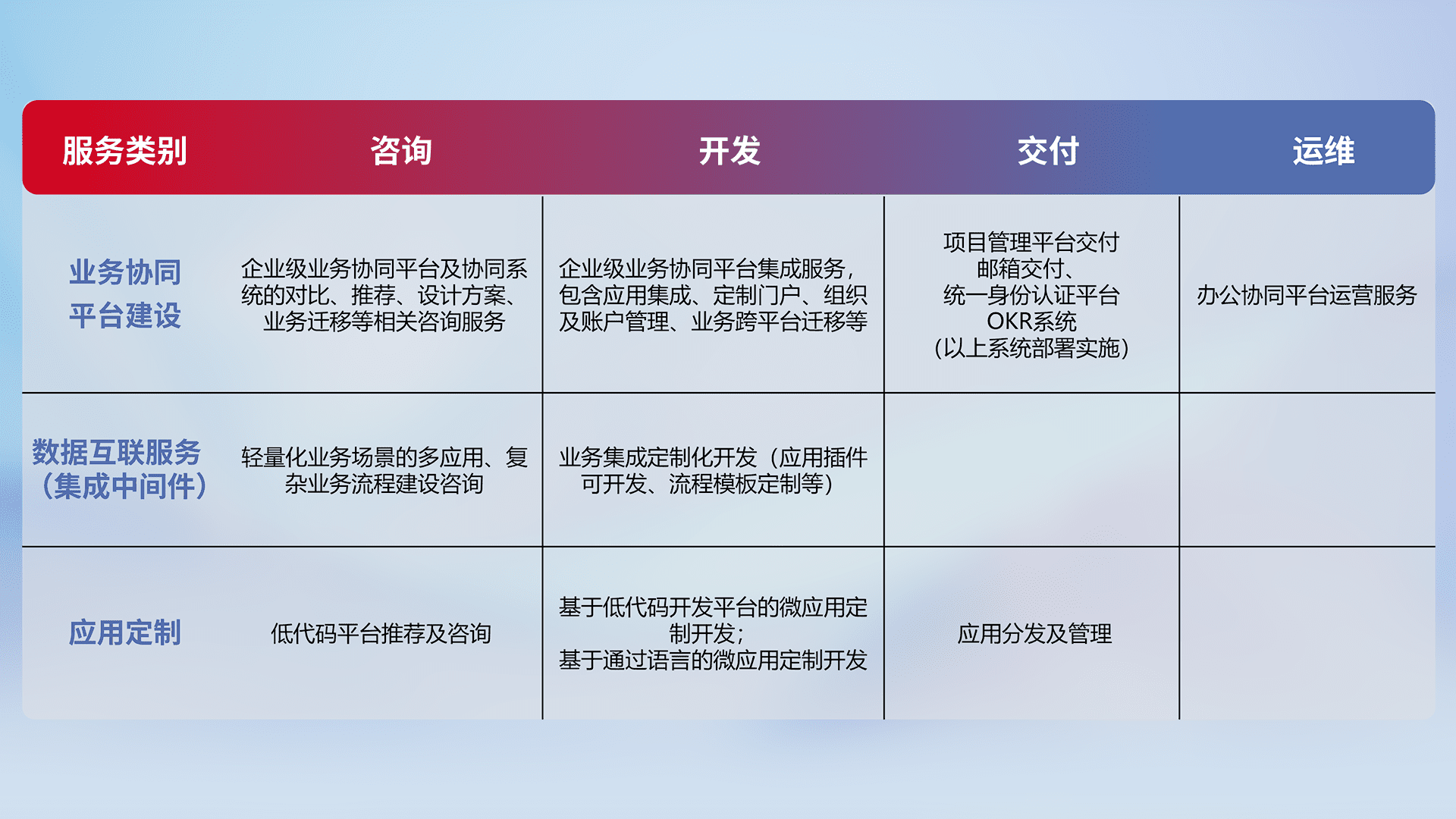 针对钉钉、、、、企微、、、、IDaas等平台级产品提供产品的规划、、、方案、、交付、、定制化开发等服务,,,,实现如统一协同办公、、、智能客户服务、、、、混合会议管理、、、、智能数据查询、、等业务场景,,,,实现数字化转型。。。。
