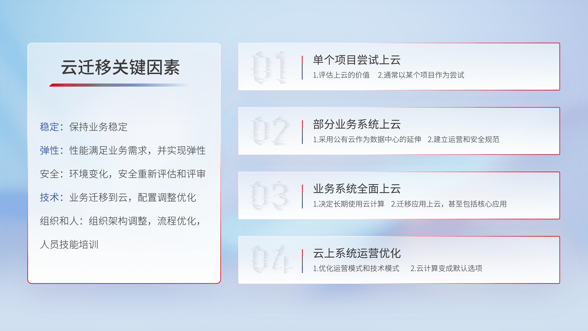 结合实际业务,,,,从规划设计、、云平台选型、、、、云原生改造、、、数据迁移、、集成交付,,,,迁移全过程为客户识别最佳上云路径,,,做好风险识别管理,,设计网络架构、、身份权限、、、、安全审计合规、、、操作审计、、、、日志审计、、监控告警策略、、、、多站点容灾设计等,,,对云上基础设施进行整体规划,,,,提升IT治理水平,,,以满足弹性、、、高可用、、、高性能的需求。。。。