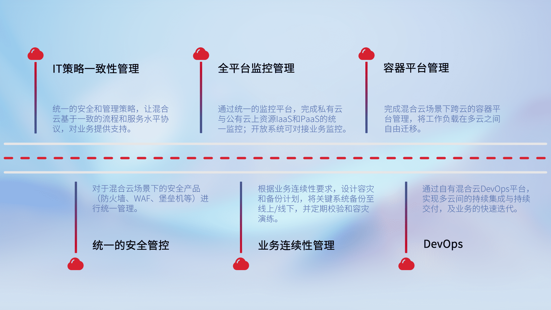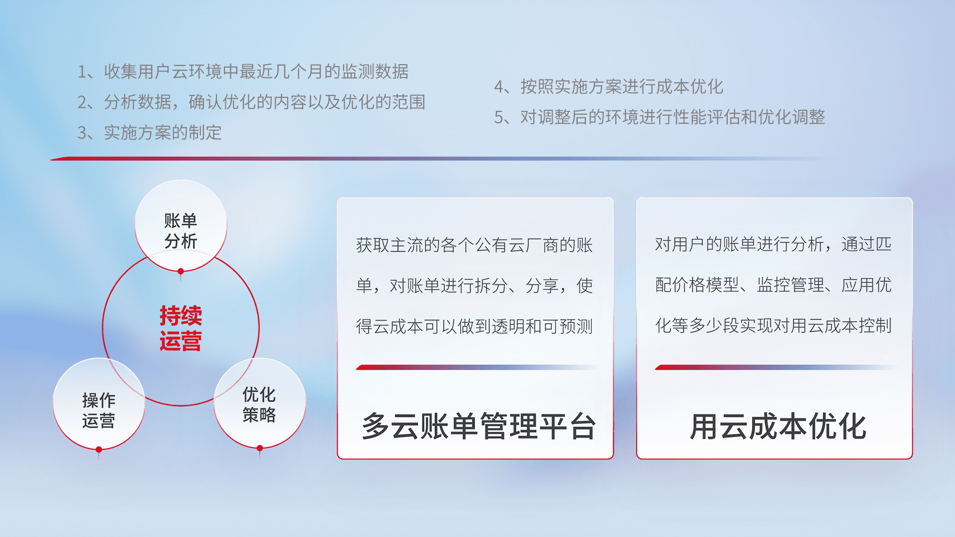 通过多云纳管,,,以统一的资源数据模型把客户的云资源进行抽象和封装,,,进而实现对多云资源的统一操作,,,保障云资源管理的可靠性、、、、稳定性与可用性。。量身定制化运维内容,,,配置、、开发运维、、补丁管理、、、、备份、、监控、、、认证和访问管理、、、、审计和日常巡检等,,,,保障在用云过程中的可靠度,,,稳定度以及高可用率。。。。