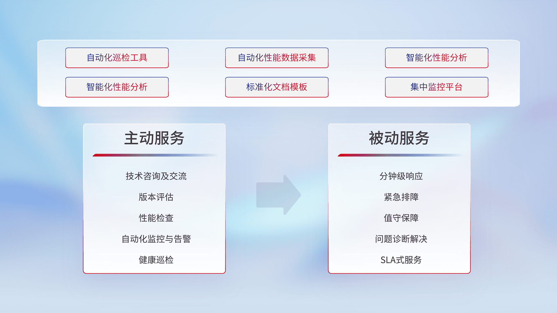 智能化工具和标准化文档,,,保障服务质量,,,,提供主动服务(包含技术咨询、、、版本评估、、、、性能检查、、、、自动化监控与告警、、、健康巡检)和被动服务包含(分钟级响应、、、、紧急排障、、、、值守保障、、、问题诊断解决、、、、SLA服务)。。
